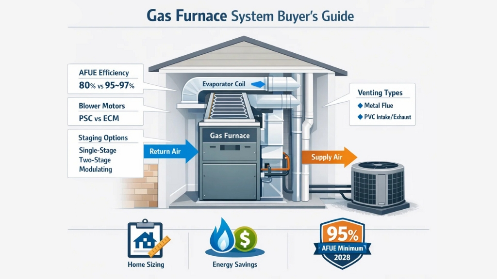 - Budget replacement today: 80% AFUE single-stage (pre-2028 installs where allowed)